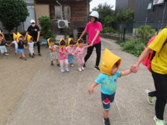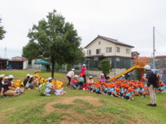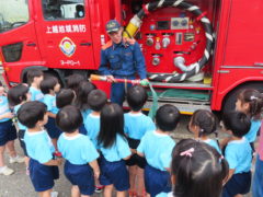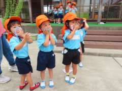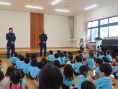 まずは園庭に避難をして、それからホールで消防署の方のお話をお聞きしました。