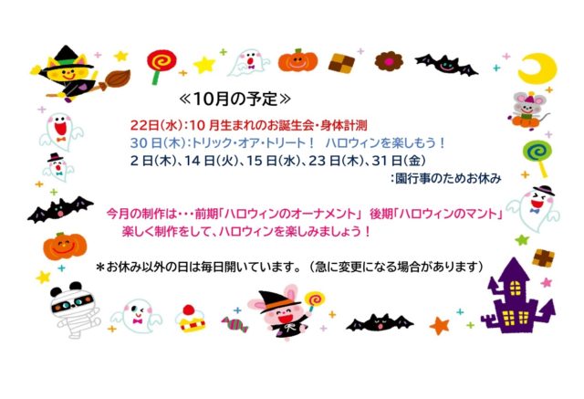 行事によりお休みの日もありますので、10月の予定でご確認くださいね📰