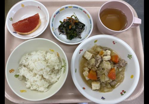 ごはん すき焼き風煮 ゆかり和え ピンクグレープフルーツでした。