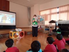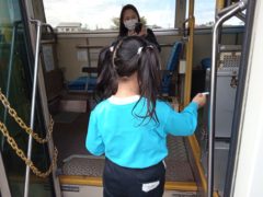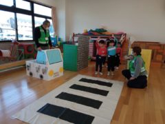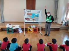 交通ルールやマナー等を学ぶ交通安全教室とバスの乗り方教室にすみれ組さんが参加しました。