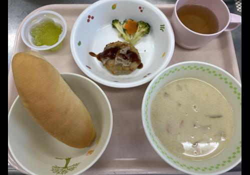 コッペパン(卵・乳不使用) れんこんのはさみ焼き ブロッコリー クリームコーンスープ ゼリー でした。