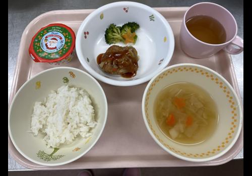 ごはん 手作りハンバーグ ブロッコリー ジュリアンスープ クリスマスゼリー