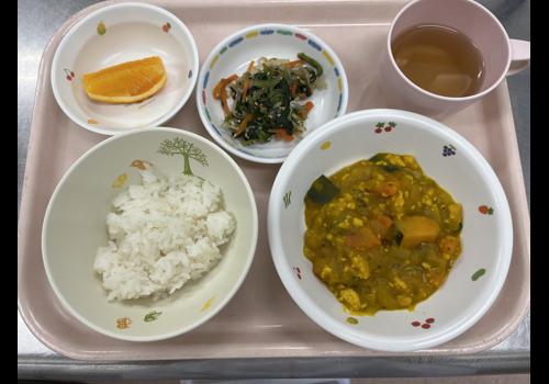 ごはん かぼちゃのそぼろ煮 もやしのごま和え オレンジ