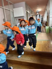 非常ベルが鳴り放送が流れ先生のお話を聞いて2階へ避難します。