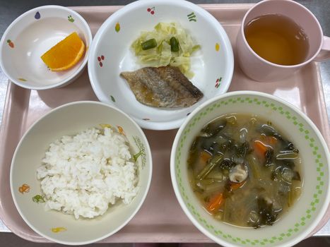 ごはん たらの照り焼き キャベツいんげん 小松菜としめじの味噌汁 オレンジ
