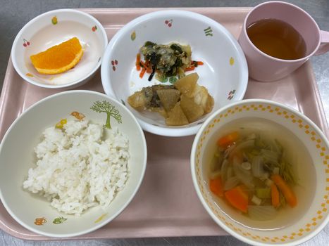 ごはん 魚の揚げ煮 ごま酢和え 塩こうじスープ オレンジ