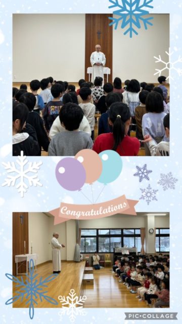 お祈りをして園長先生のお話を聞き、季節の歌『雪』をみんなで歌いました。