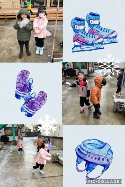 園でも中庭や園庭、園庭に続く道が凍っており、天然のスケートリンクになりました✨
