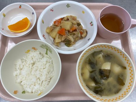 ごはん ツナじゃが 味噌汁(里芋、たまねぎ、わかめ) オレンジ