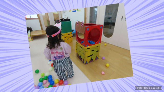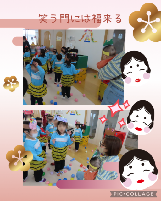 鬼のお面をかぶって、豆(ボール)を鬼さんに投げて鬼退治成功しました✨