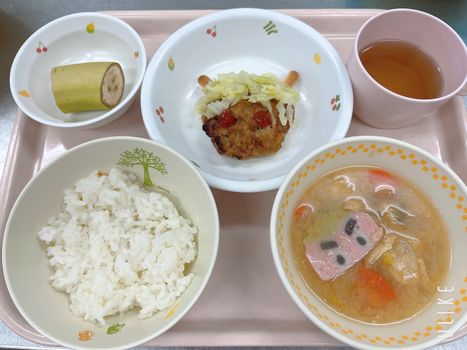 ごはん 鬼は外ハンバーグ 福はうちまめ汁 バナナ