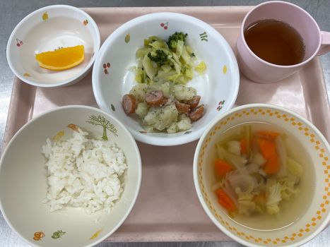 ごはん リヨネーズポテト グリーンサラダ コンソメスープ オレンジ