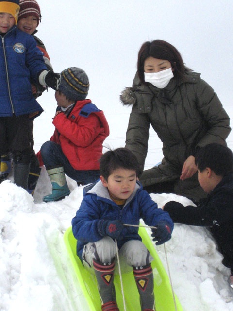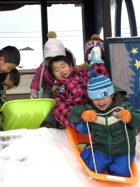 「それ!いくぞ!」「ソリ遊び楽しいなぁ!」