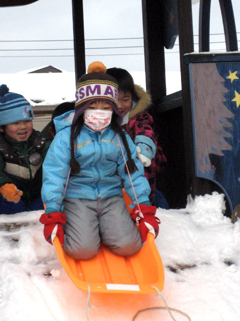 雪がたくさん降り積もると広い園庭がスキー場に返信~~!