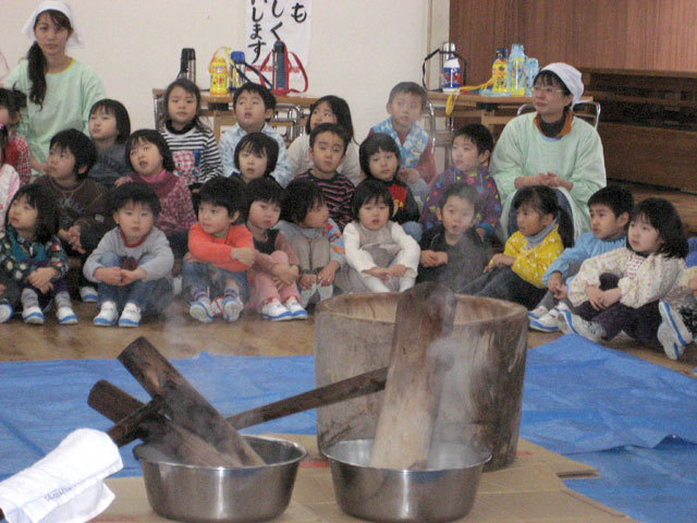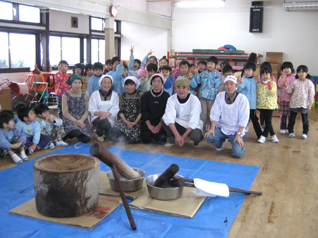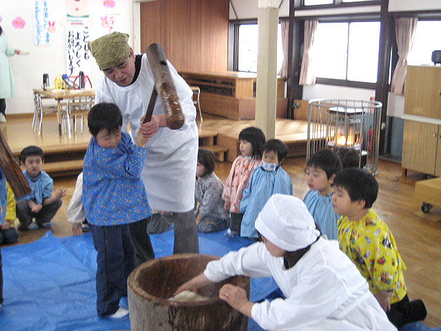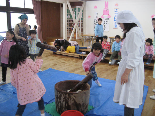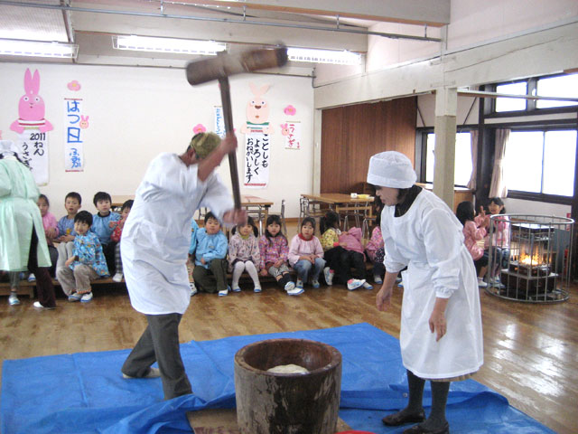臼と杵で「ペッタン、ポットン」おもちつき、皆で力を合わせて