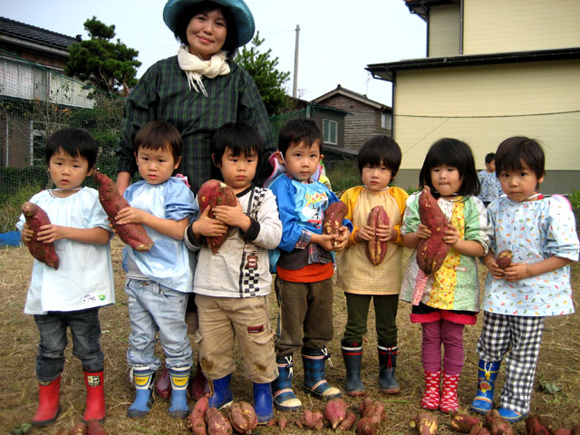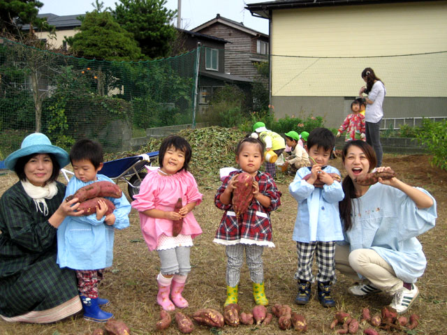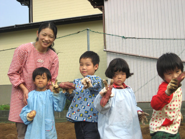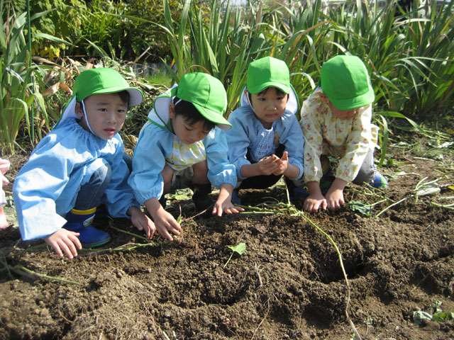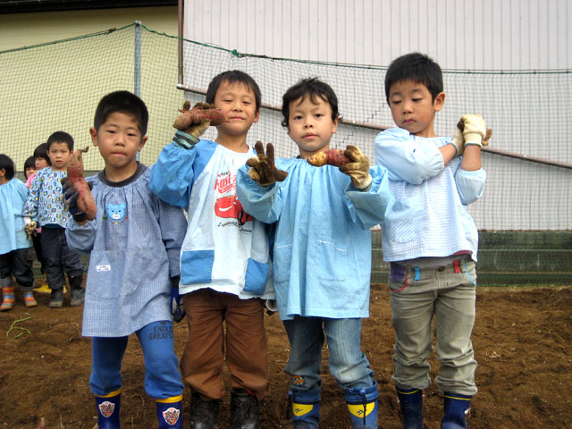 広~い園庭の畑で「よいしょ!よいしょ!」おいもほりをしました。