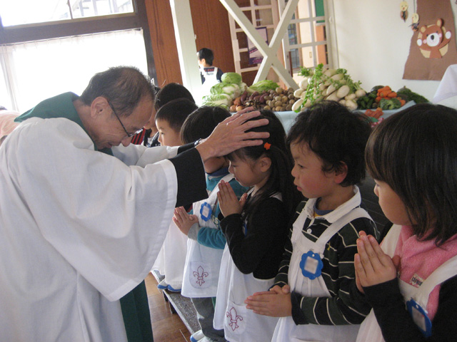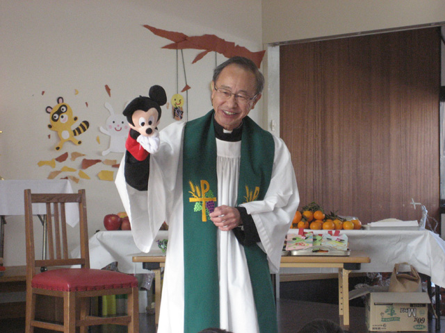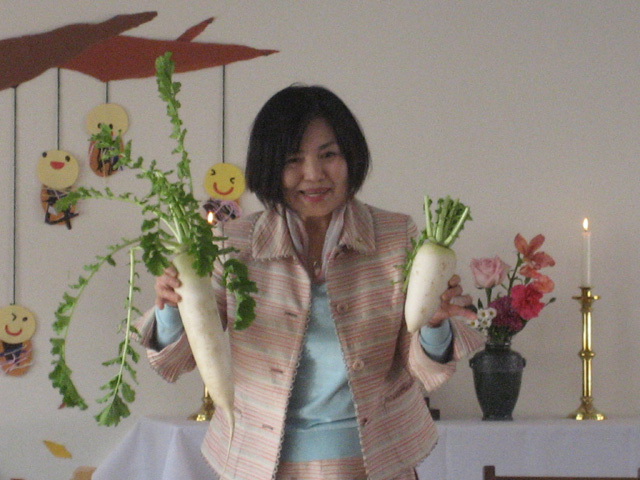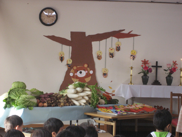 今年収穫された野菜や果物をお捧げして、感謝の礼拝をしました。