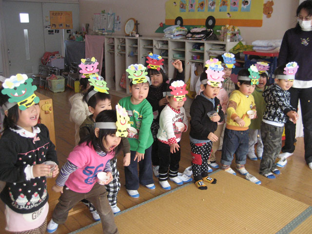 強そうな紫鬼、黒鬼の登場に大きな声で、「鬼は外!」豆を投げる手に力が入りました。