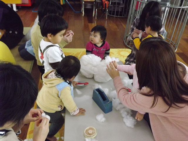 あったか~いお部屋の中で、真っ白い雪だるまを作りました。