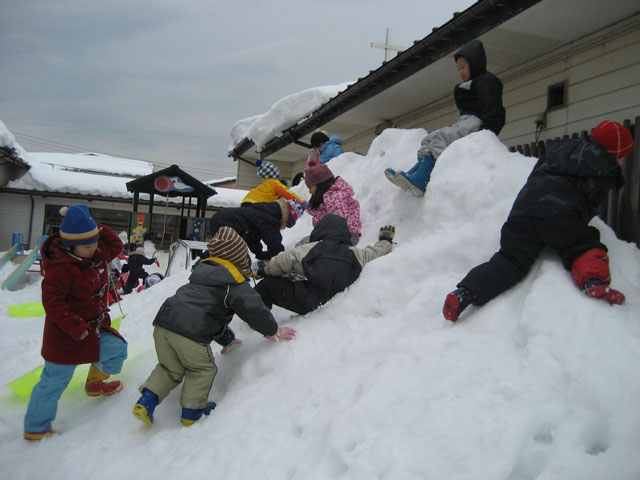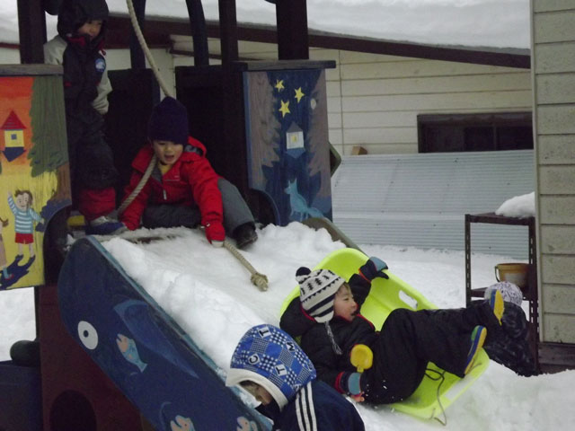 子どもたちにとって、広い園庭の雪は魅力的、大好きです!