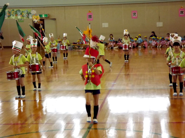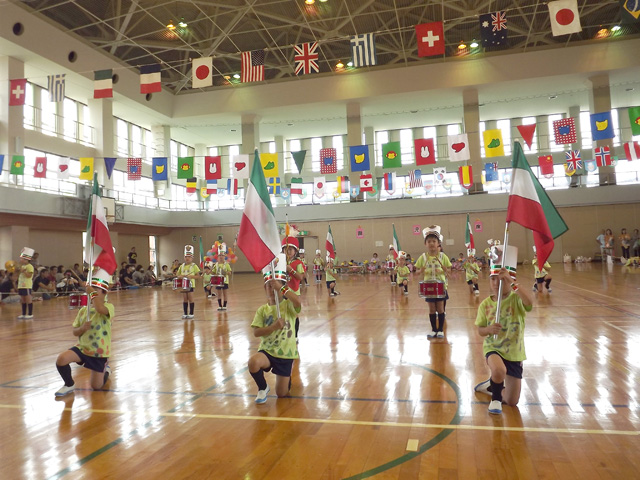 すみれ組が「123~恋がはじまる」の曲にのせて鼓隊・カラーガードが