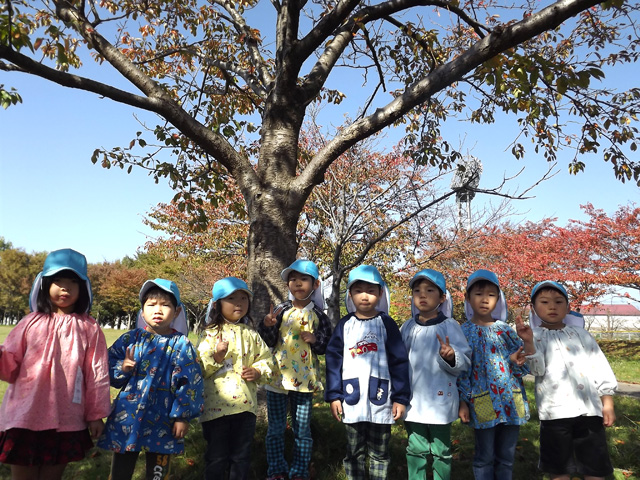 年長すみれ組と年中ちゅうりっぷ組が、青空が広がる秋の日に