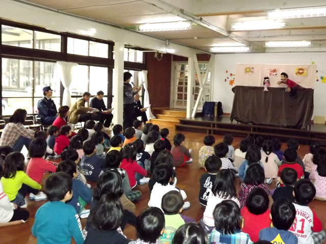 地域の役員の方々やおまわりさんが園に訪問して、危険から身を守るように