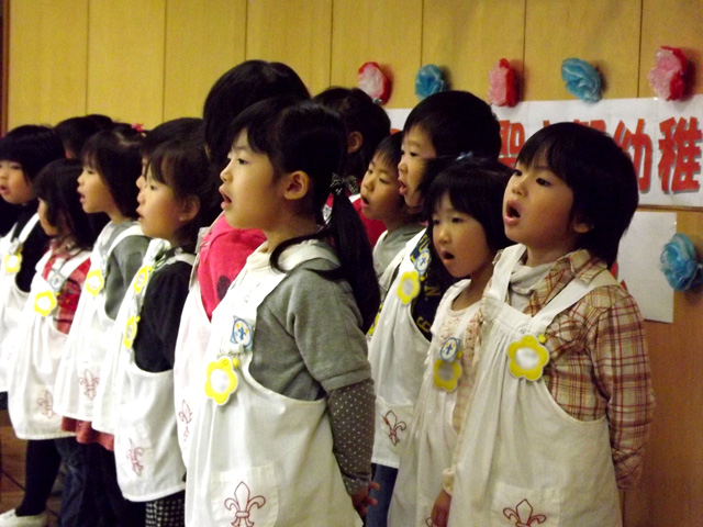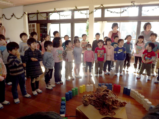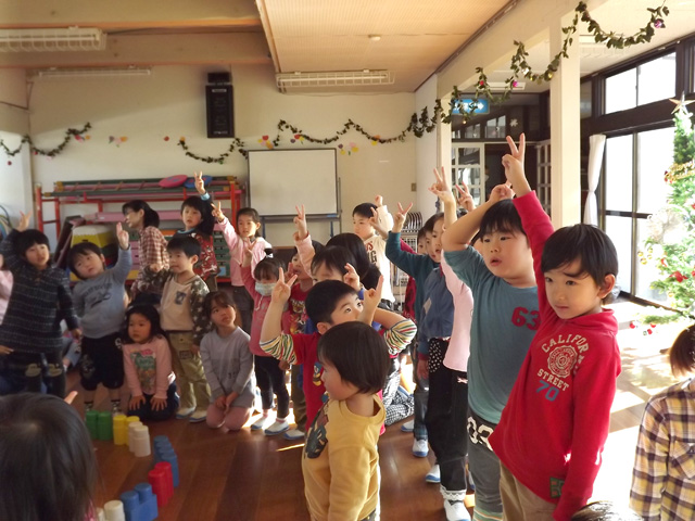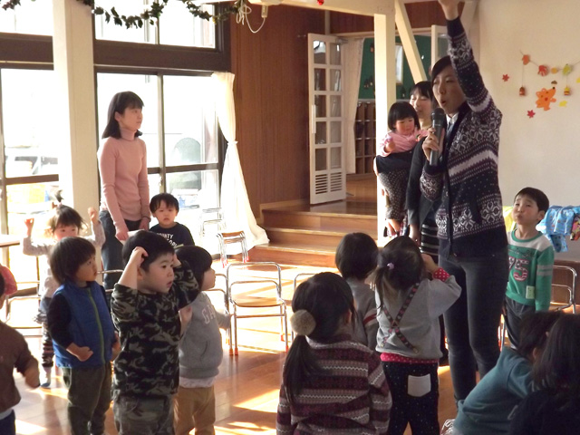 風が強くあいにくの天候だったため、ホールに集まって、「グー・チー・パー♪」と歌ったり、