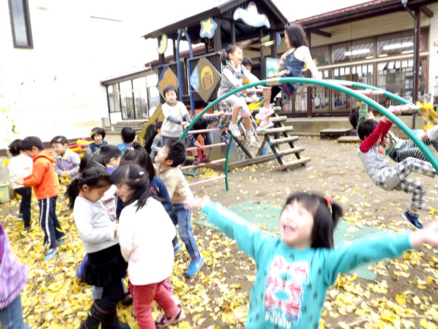 風のいたずらで広~い園庭が、黄色のじゅうたんで敷きつめられました。