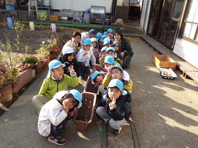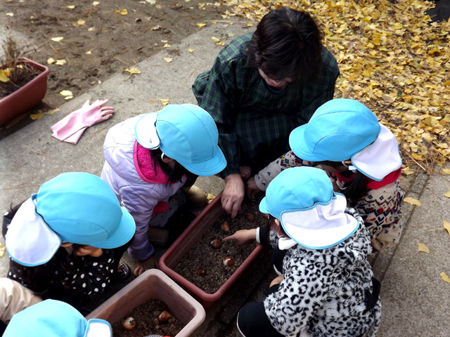 春に咲くちゅうりっぷの色とりどりの球根を、年中ちゅうりっぷ組の子どもたちが