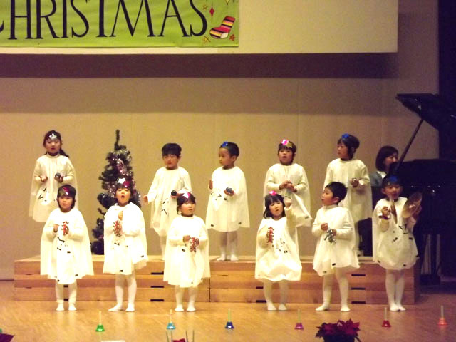 かわいらしいもも組・さくらんぼ組のお遊戯、ハンドベルの音色が響いたちゅうりっぷ組の合奏で、
