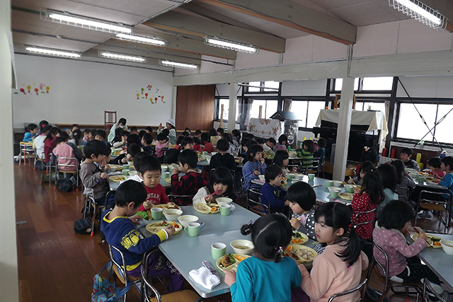 「すみれ組さんと一緒に給食を食べるの最後だね。さびしいなぁ。」