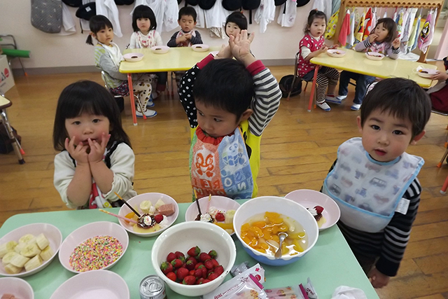 聖上智幼稚園の全園児が集まって 会食をしました。