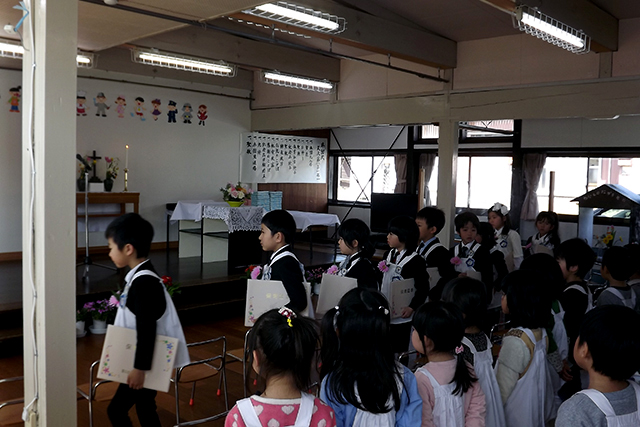 年長児を送り出す日、♪しずかにしずかにーに見つめていよう♪