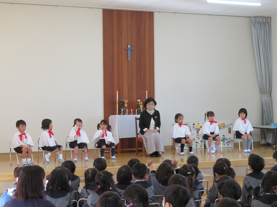 紅葉が美しい季節に生まれた11月生まれのお誕生会がありました。 みのりの秋に生まれ、感謝する月に生まれた子どもたちです。 うれしいあきの…♪の聖歌を歌ってみんなでお祝いしました。