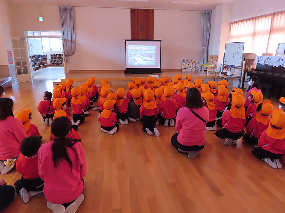 ホールに集まり、地震や津波のDVDを見たり、避難帽子を被る練習を行いました。