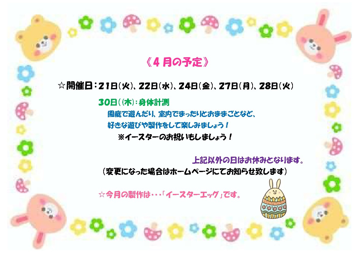 在園児との交流 / 季節の制作 / 季節の行事 / リズム遊び / ゲーム / 畑の種まきや水やり