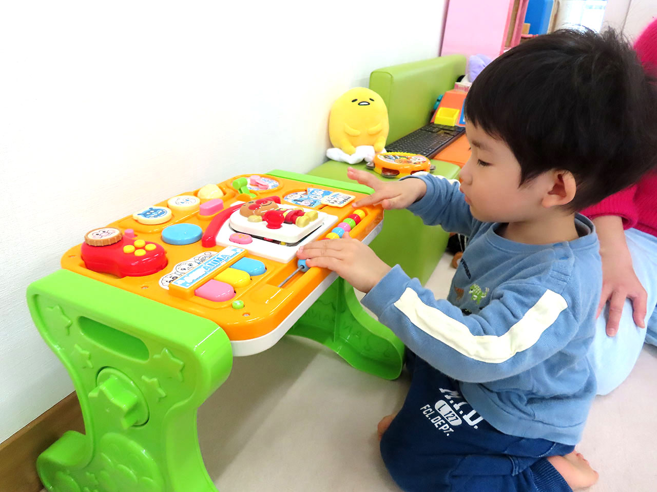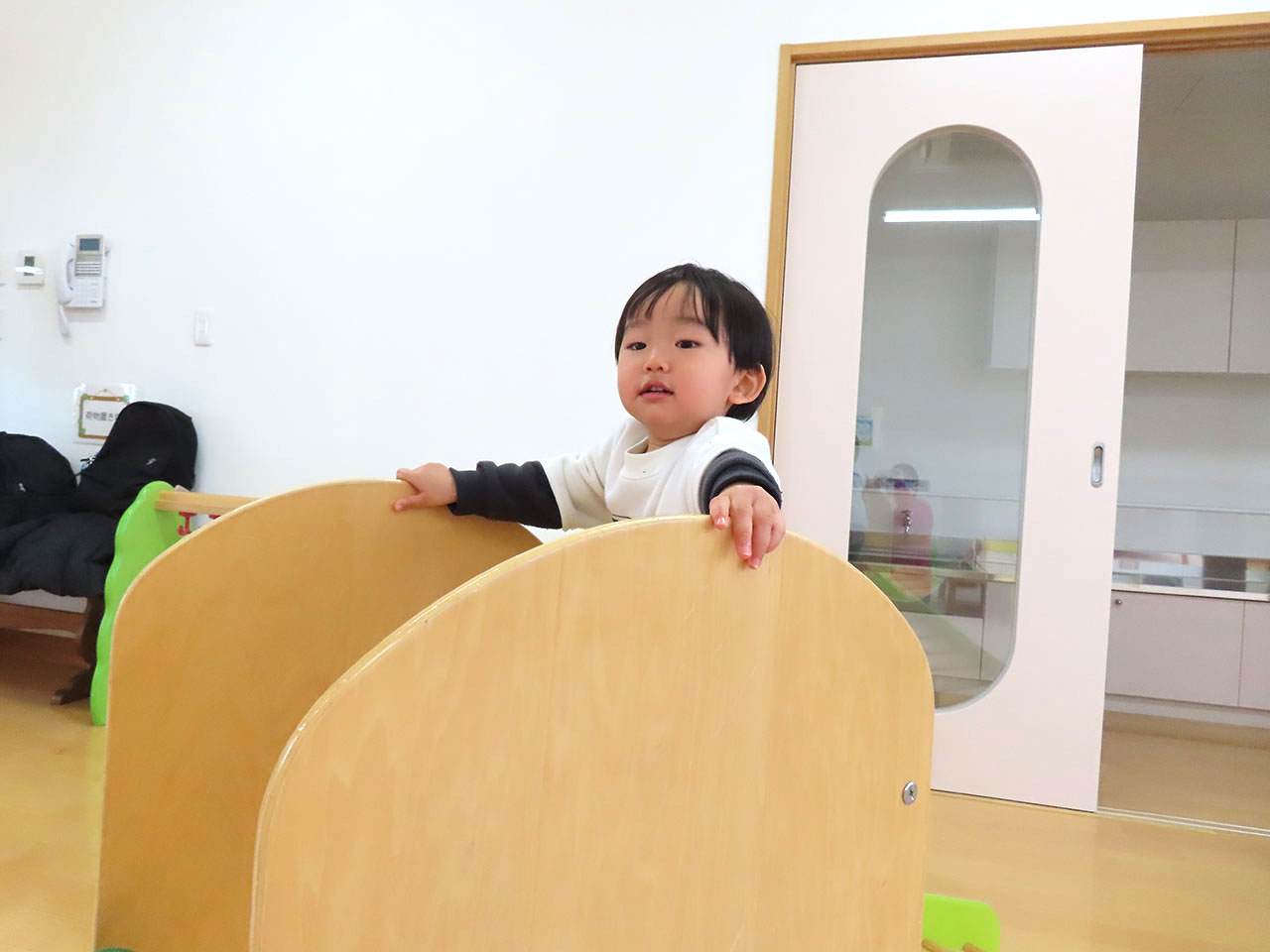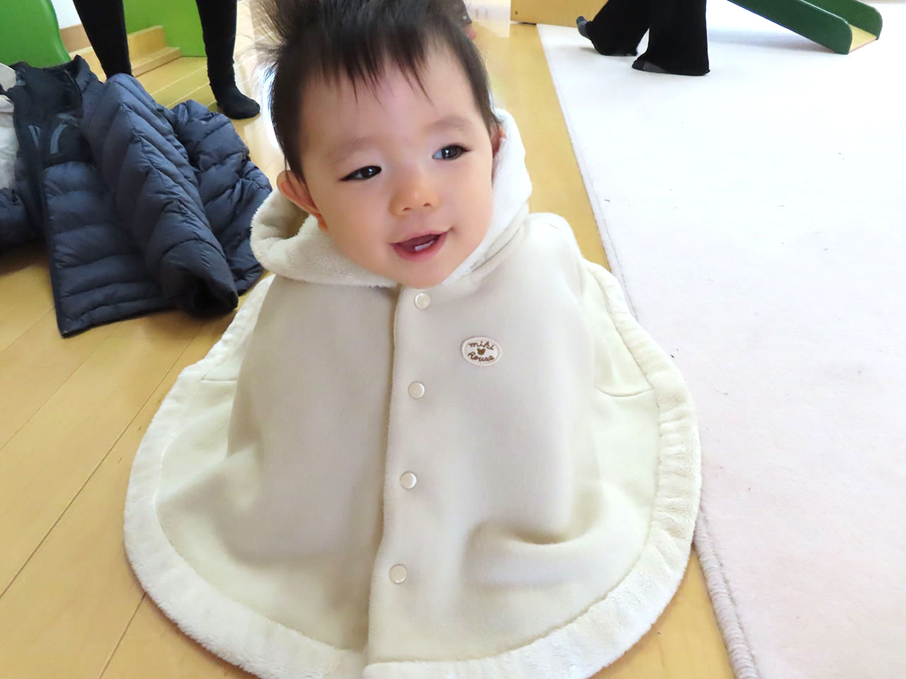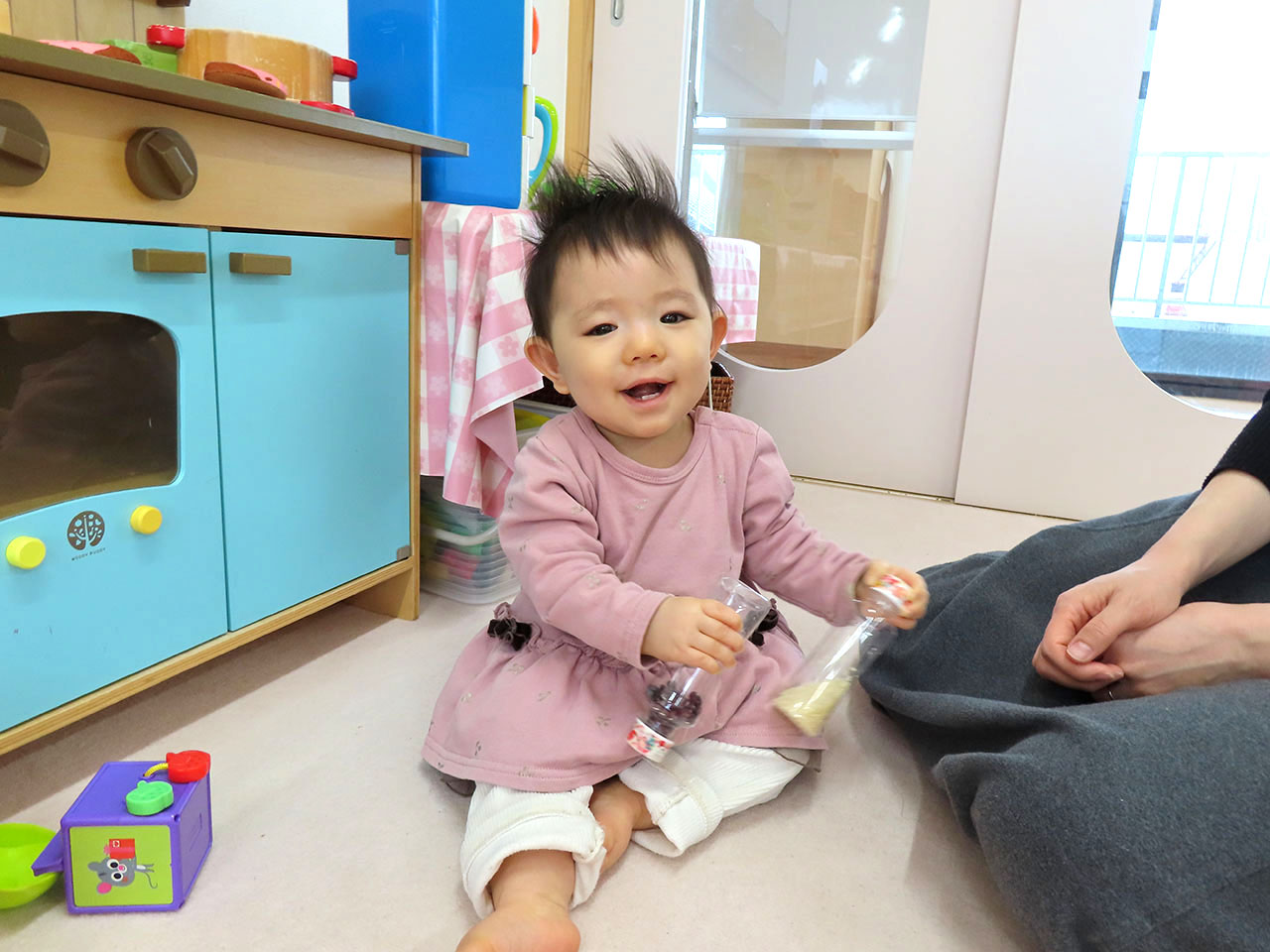 1歳児のお部屋ではすべり台を一緒に滑ったり