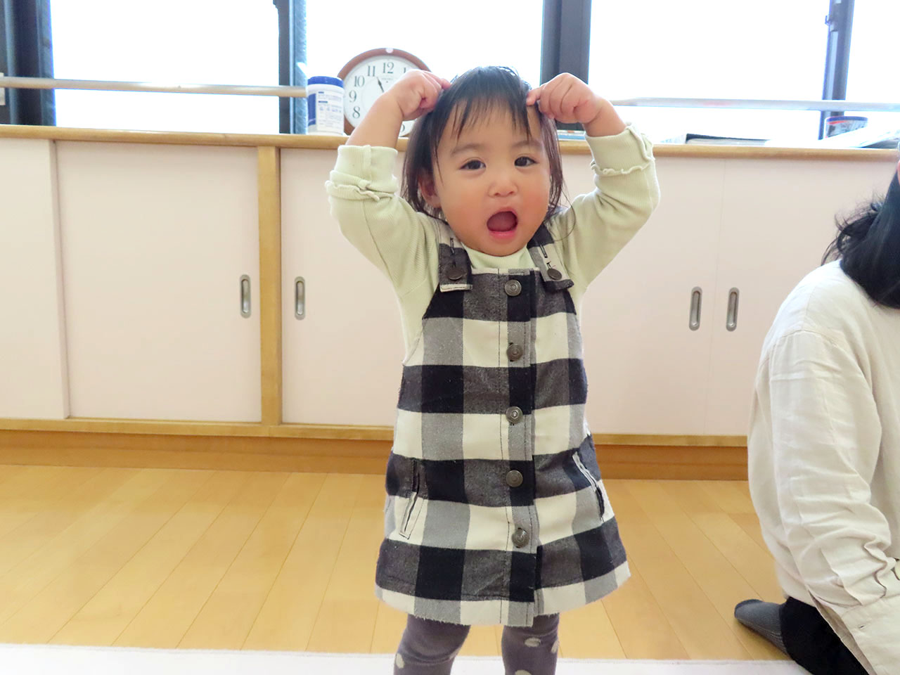2歳児さんとはホールでかけっこをしたり体操をしたりして